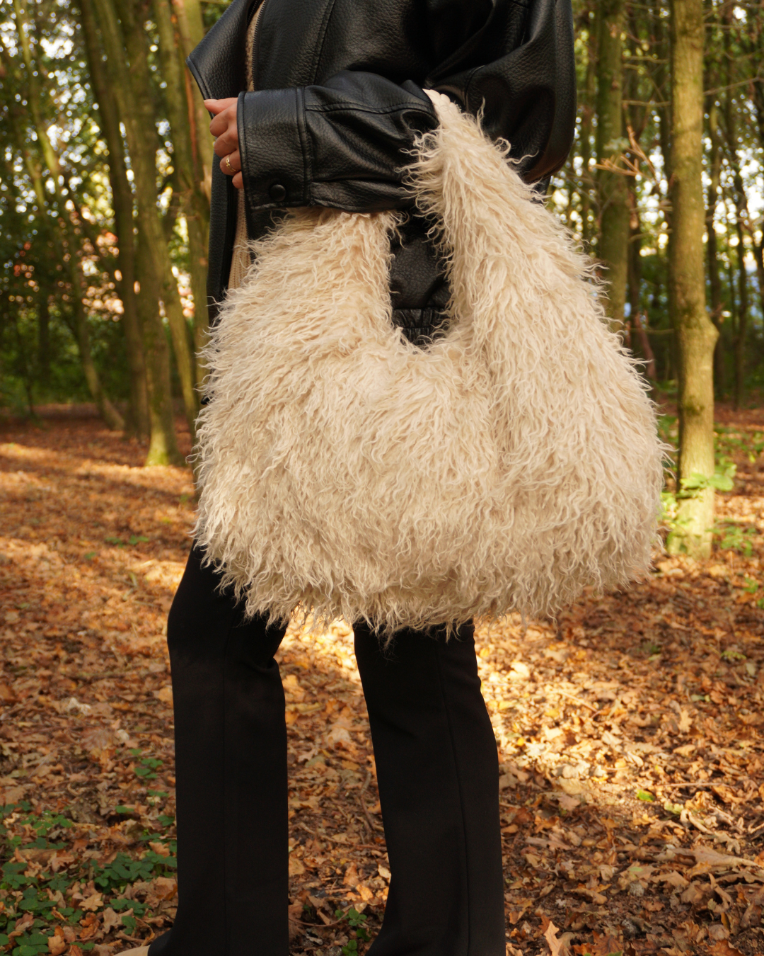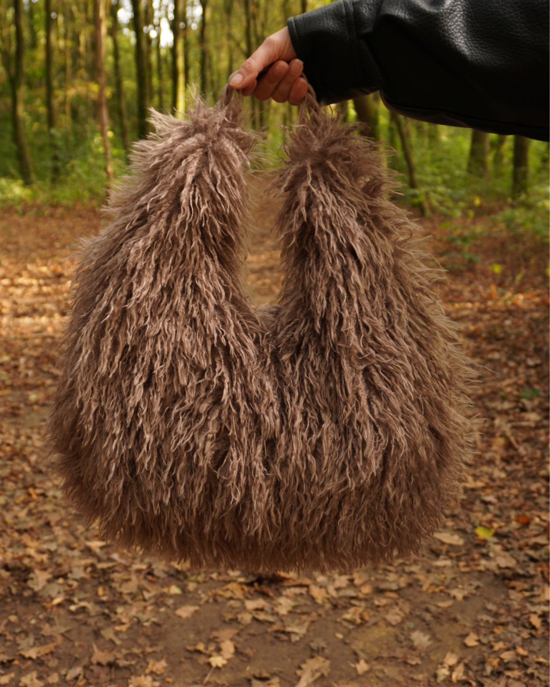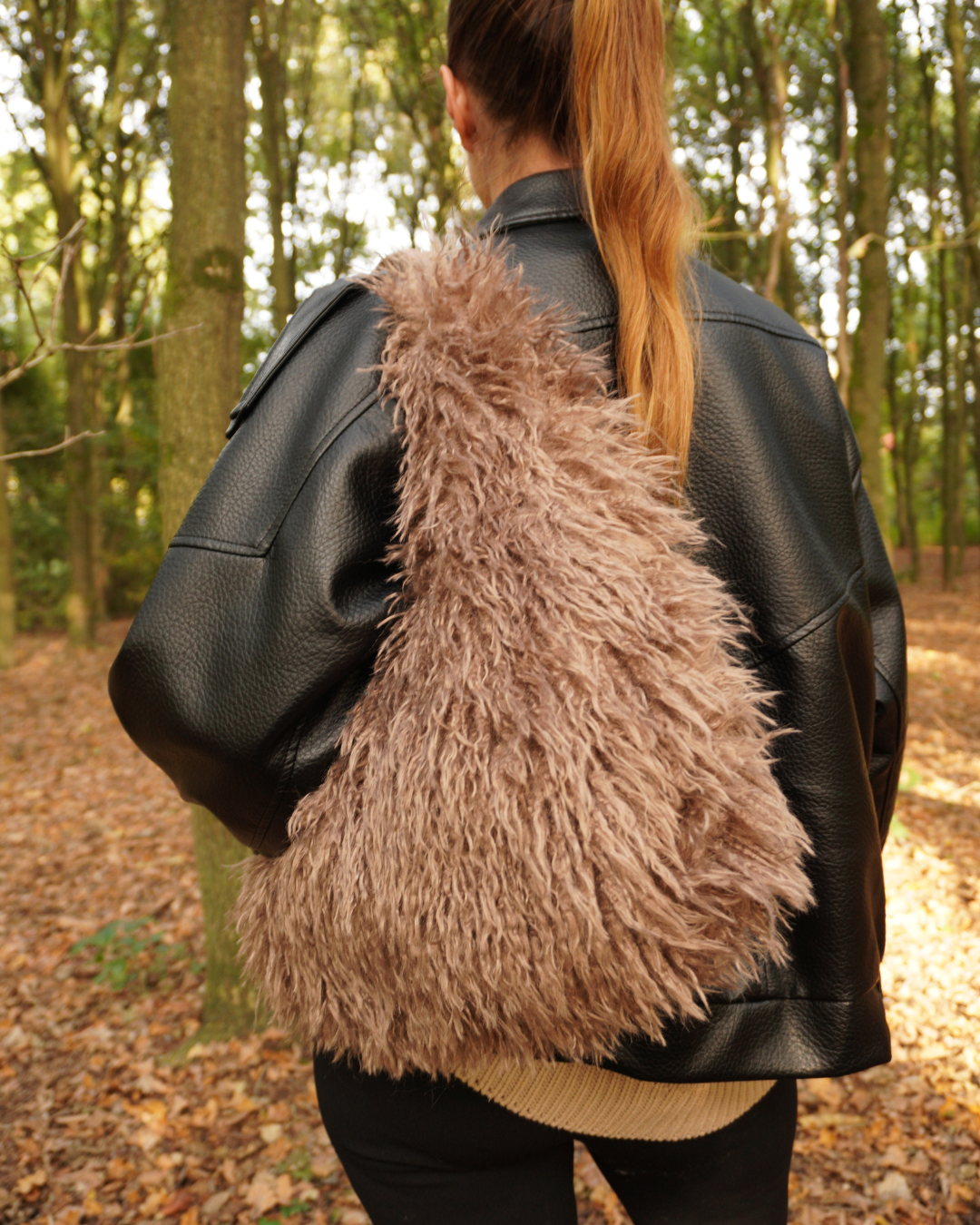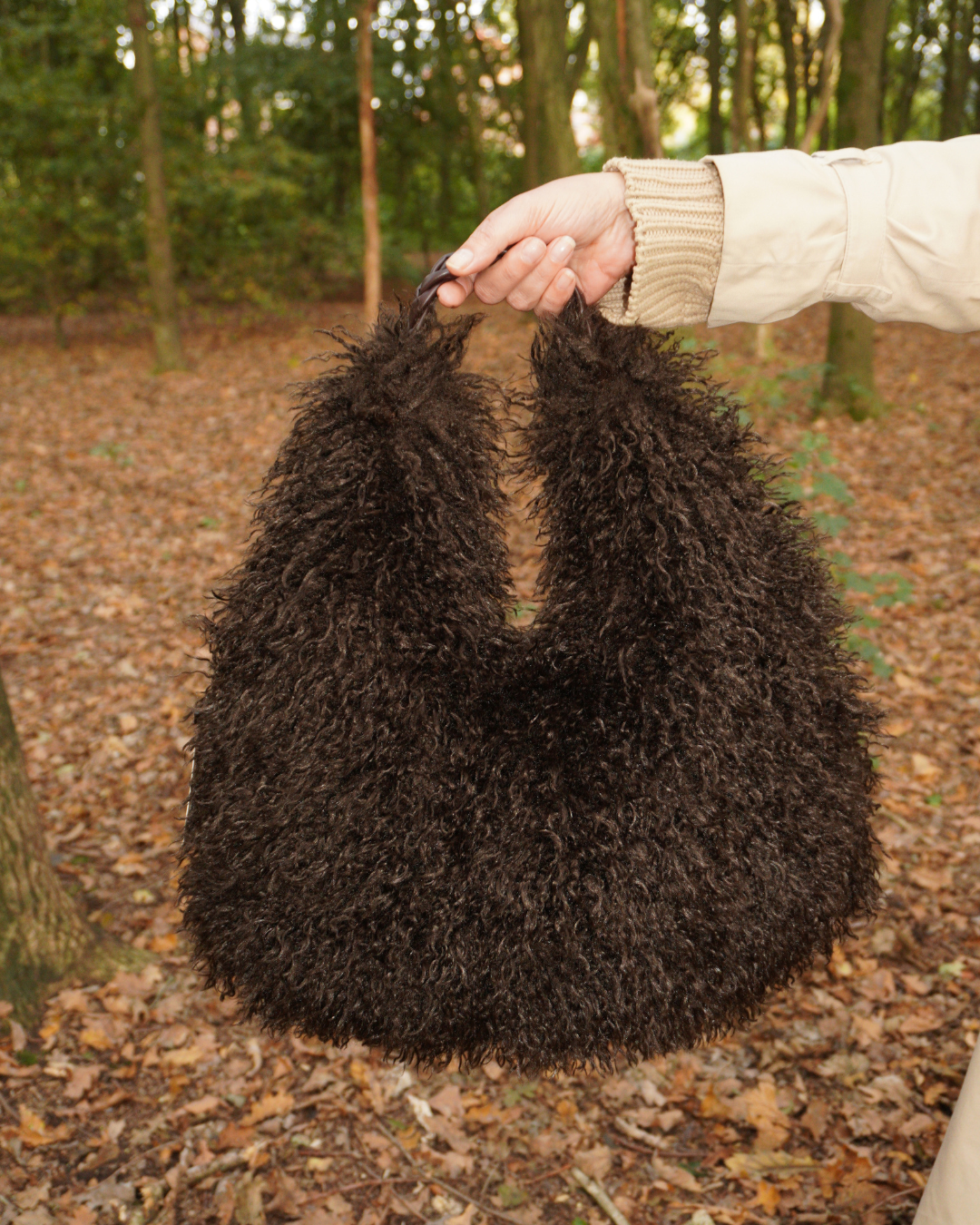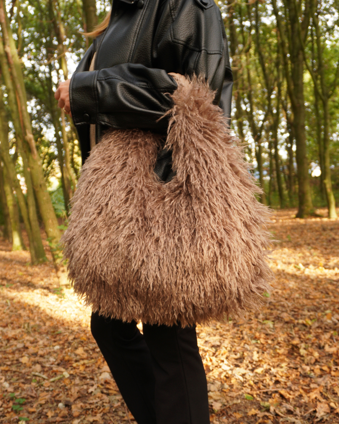 De Handtas Aria straalt pure elegantie uit met door het donkerbruine imitatiebont en luxueuze details.