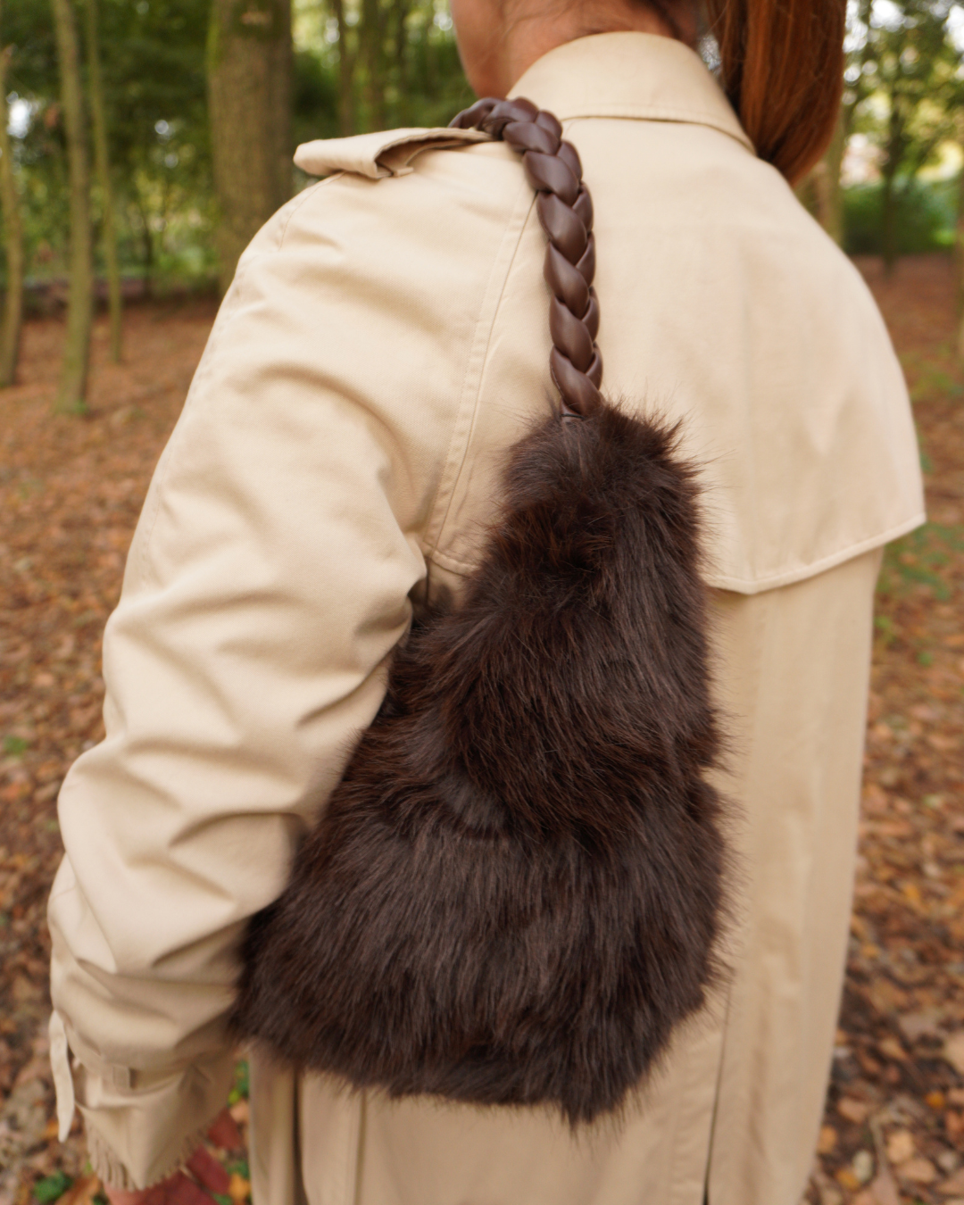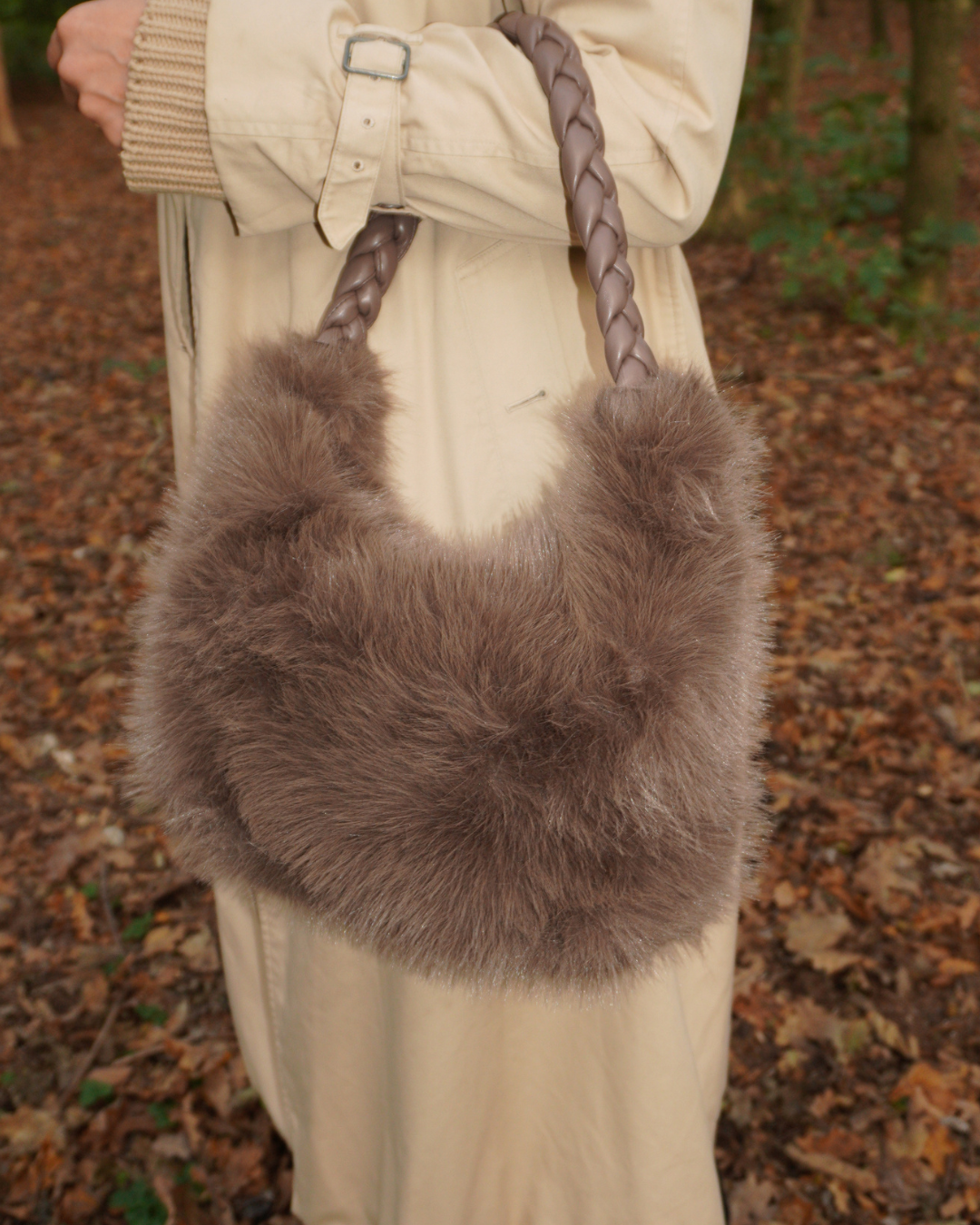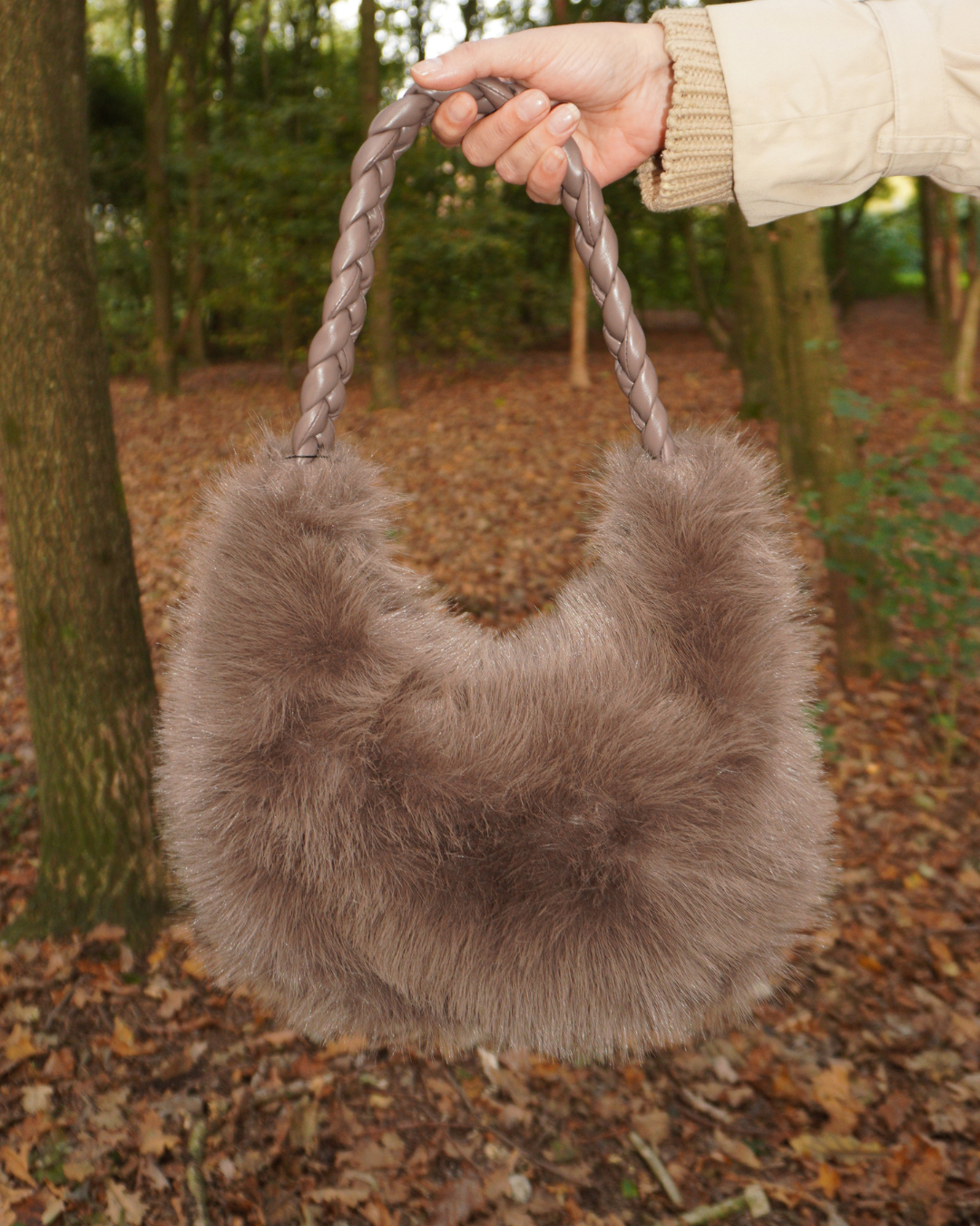 Deze prachtige tas is gemaakt van zacht imitatiebont en voorzien van een gevlochten hengsel dat direct in het oog springt.