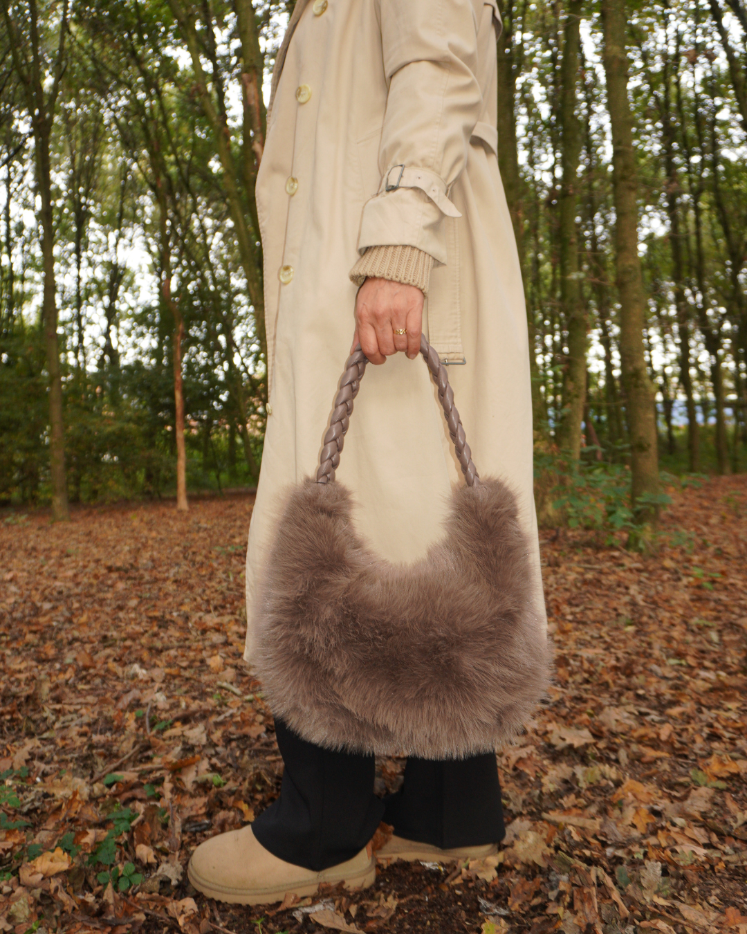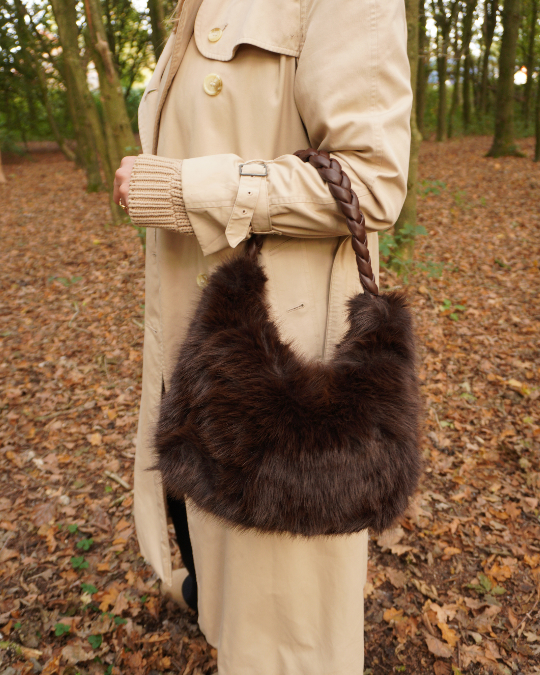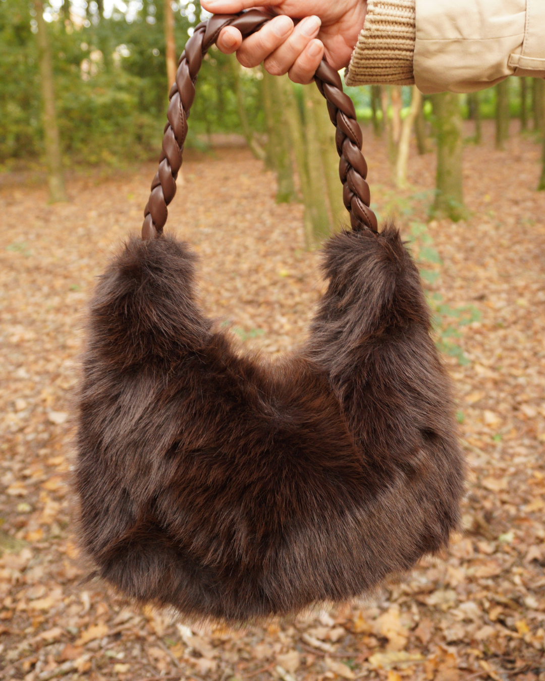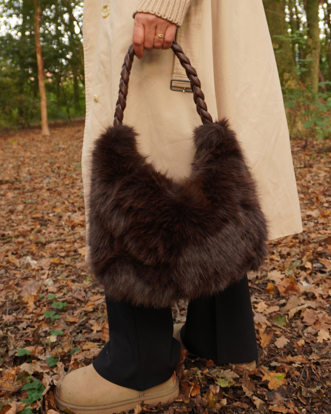 Deze prachtige tas is gemaakt van zacht imitatiebont en voorzien van een gevlochten hengsel dat direct in het oog springt.