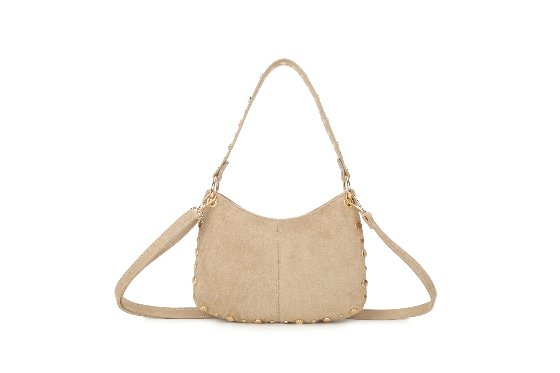 Stijlvolle suede schoudertas met goudkleurige studs, compact maar praktisch. Voorzien van een stevige handgreep en een afneembare schouderriem. Luxe afgewerkt en geschikt voor elke outfit.