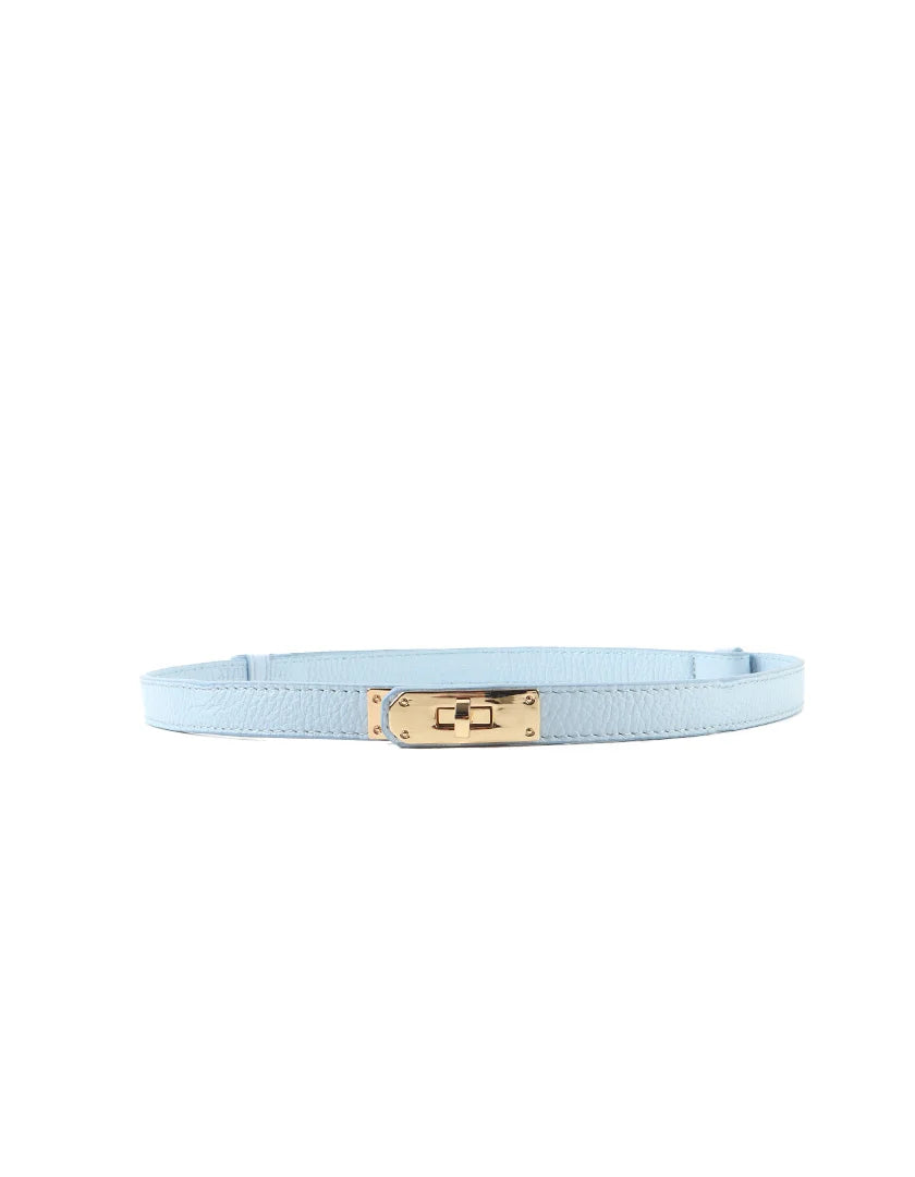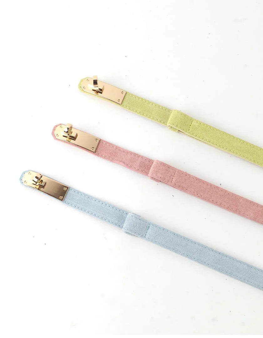 De Yara riem van suède is een stijlvolle toevoeging aan elke outfit en is afgewerkt met een elegante goudkleurige draaisluiting.