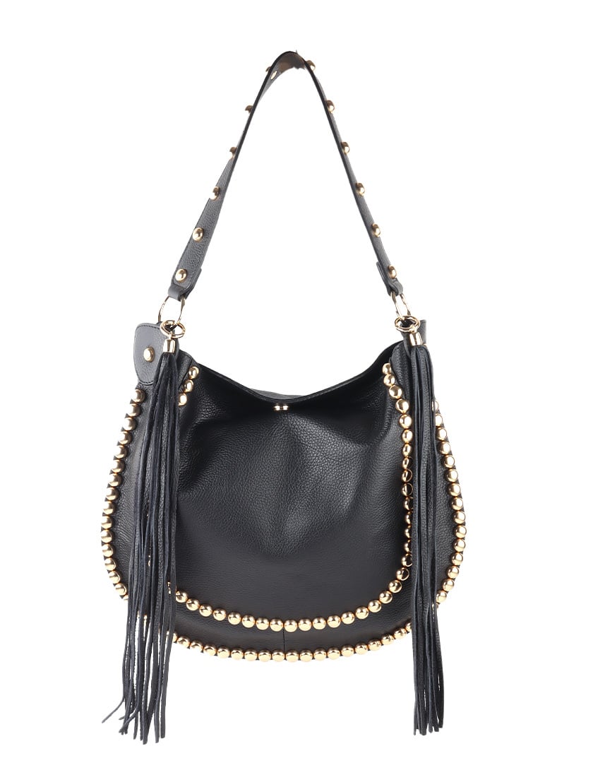 De Yvonne tas is een opvallende schoudertas van echt leer, afgewerkt met goudkleurige studs en franjes. De franjes zijn afneembaar, waardoor je de tas eenvoudig een andere uitstraling geeft.